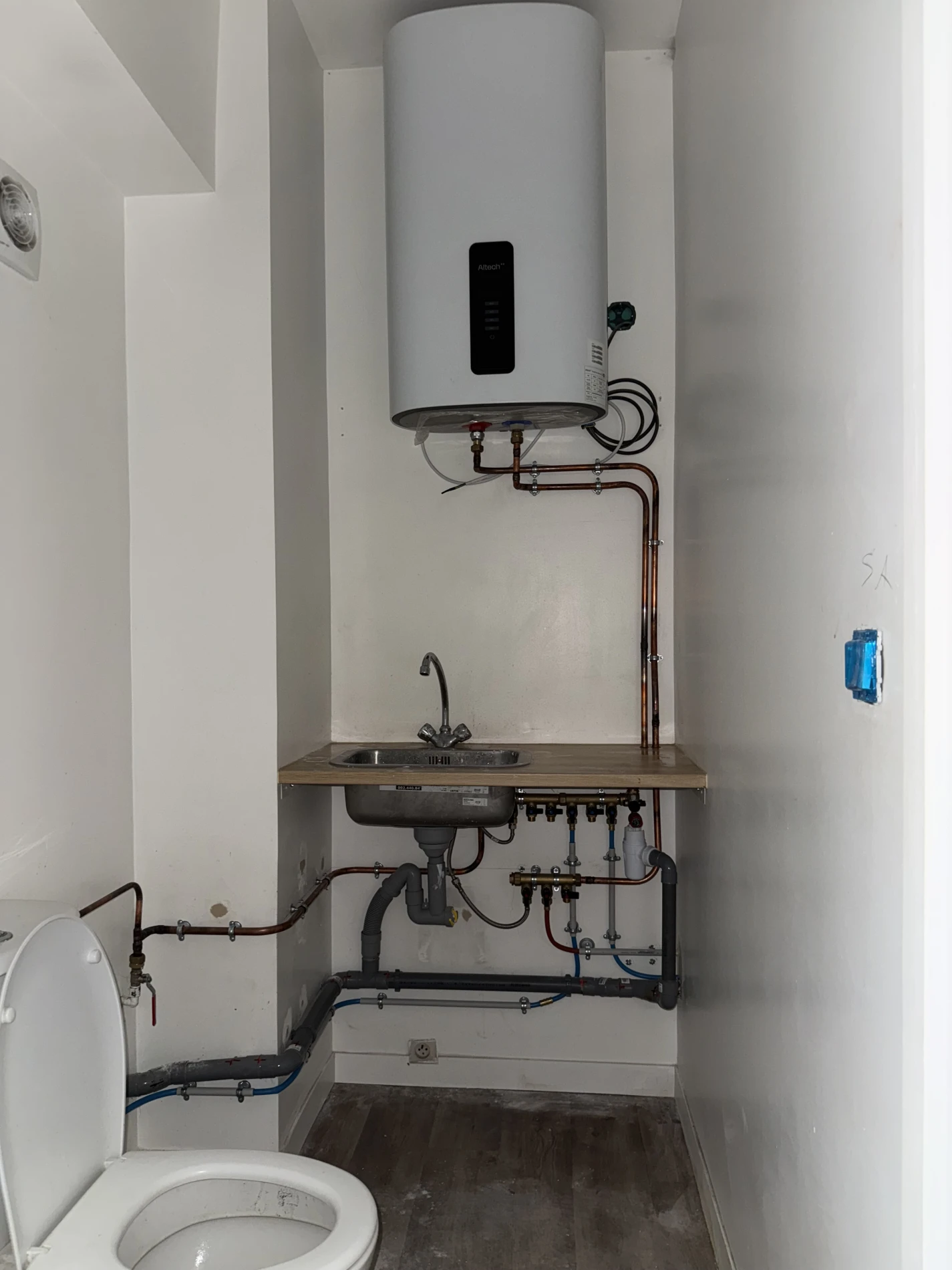 Dans le cadre de l'aménagement d'une boulangerie, un chantier complet de plomberie a été réalisé afin de répondre aux besoins en eau chaude, eau froide et évacuation.