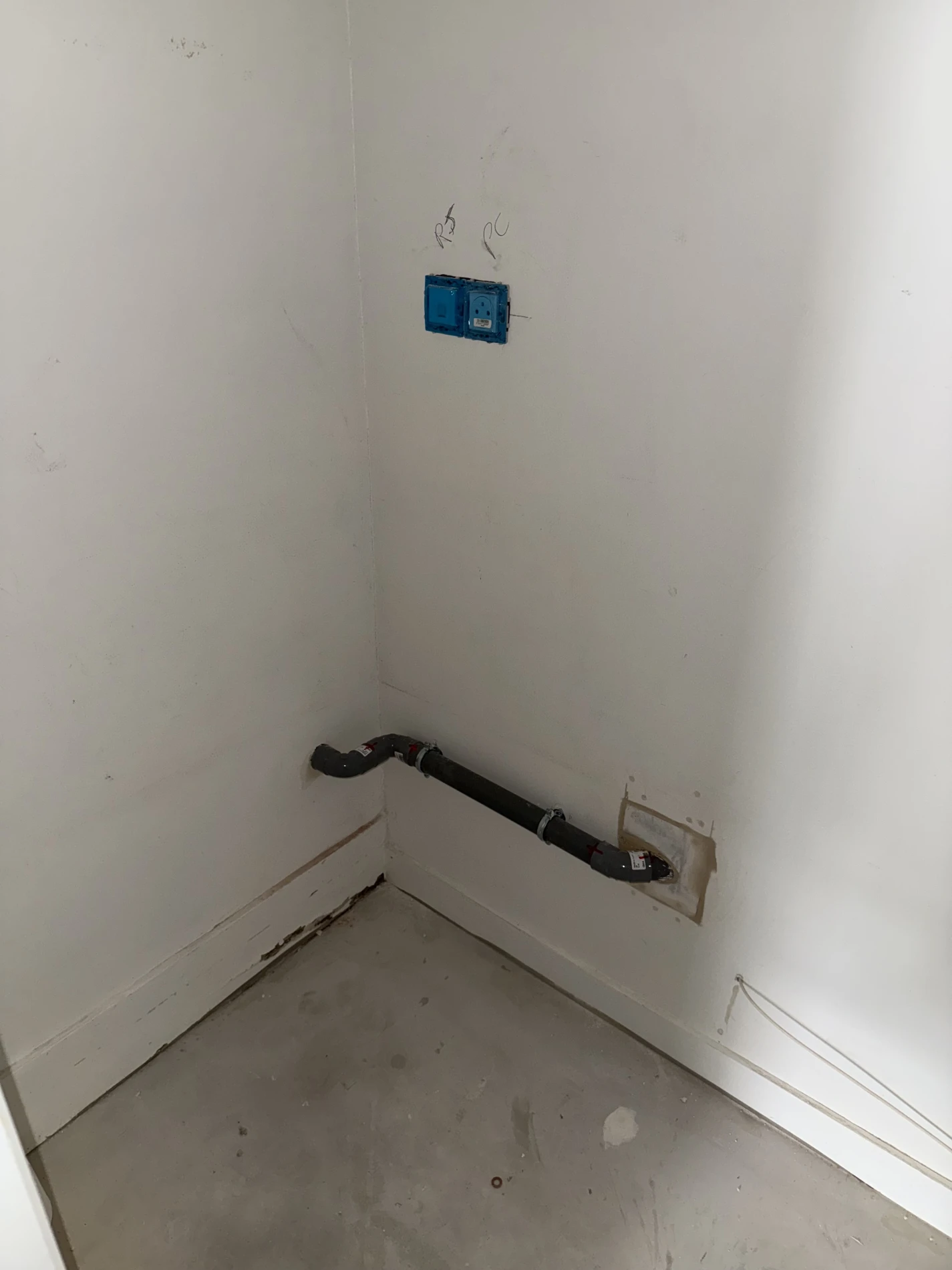 Le second regroupe également trois évacuations, cette fois accompagnées d'une arrivée d'eau froide seule. Les canalisations en PVC fixées proprement le long des murs, garantissent robustesse et facilité d'entretien.