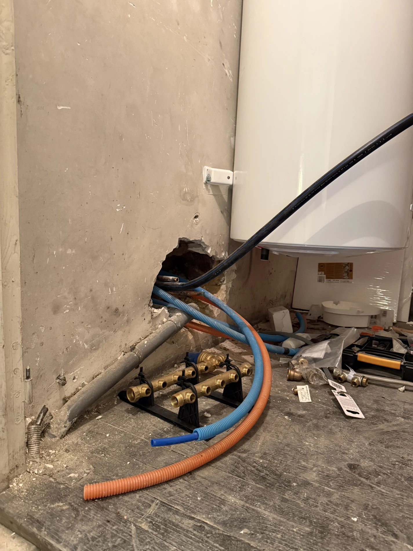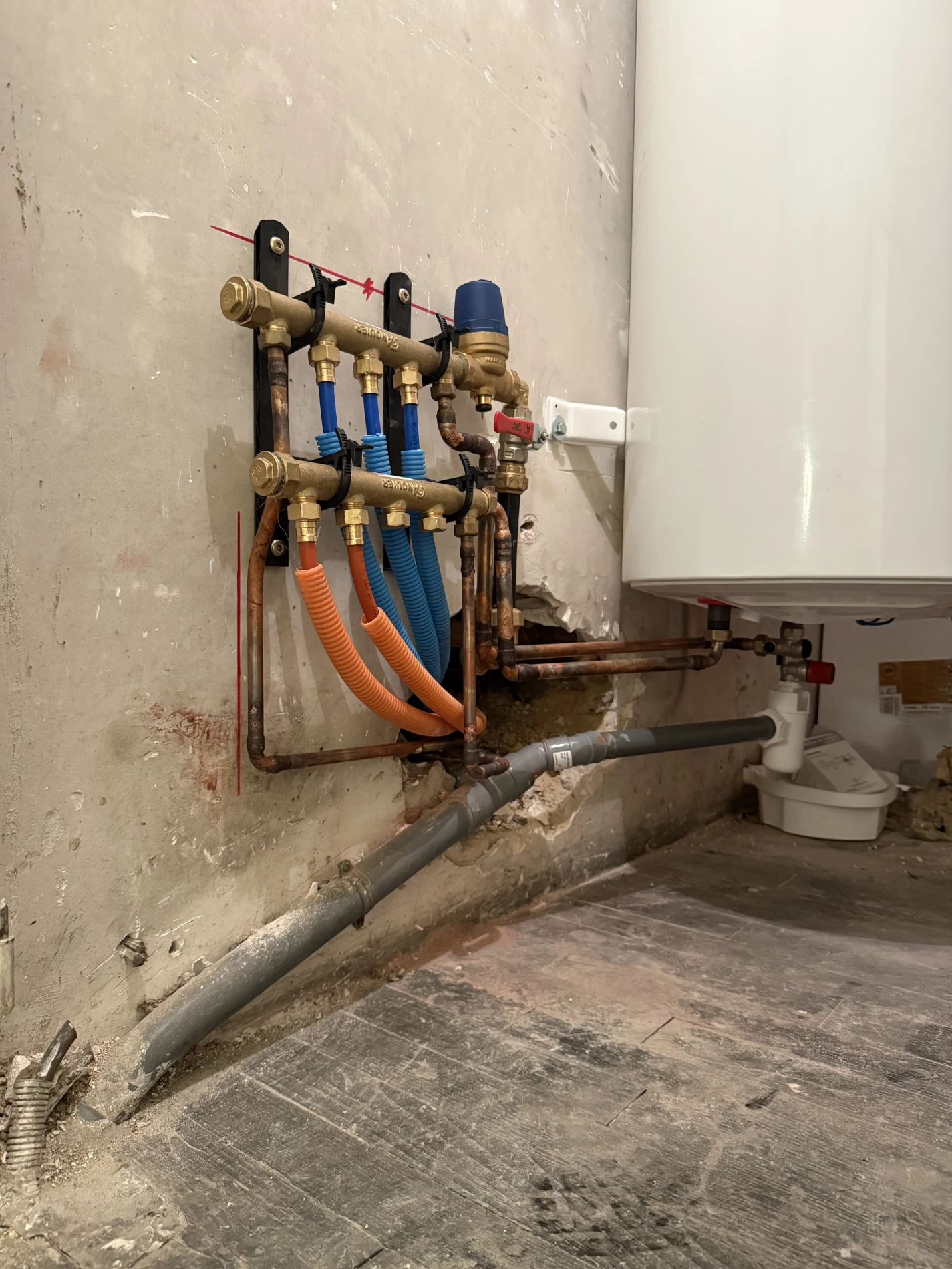 Création d'une nourrice de distribution pour un appartement (eau chaude et eau froide), raccordement de la nourrice en per/cuivre et raccordement d'un ballon d'eau chaude Atlantic avec reprise de l'évacuation sur l'existant. Vanne d'arrêt pour couper l'eau générale de l'appartement.